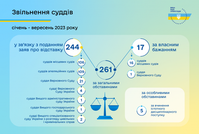 Протягом січня – вересня 2023 року Вища рада правосуддя прийняла рішення щодо звільнення 266 суддів.